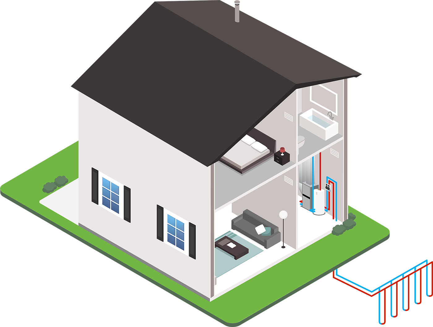 The earth absorbs and stores almost half of the solar energy from the sun. Due to this, the temperature four to six feet underground is moderate all year long, no matter your geographic location, staying between 45°F - 70°F. The geothermal system uses this moderate temperature underground to transfer heat from your home to the earth (and vice versa) using a ground loop field buried in the yard. The loop field circulates a water-based solution through a series of pipes. A quality ground loop field installation is essential to the operation of the geothermal system.